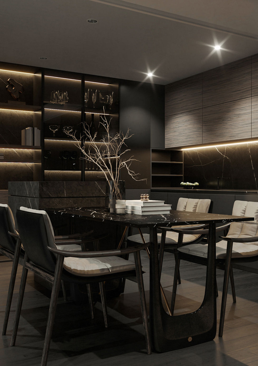 This project focuses on modern kitchen and dining areas with minimalist design and elegant settings. The designs feature sleek cabinets, marble islands, and neutral tones.